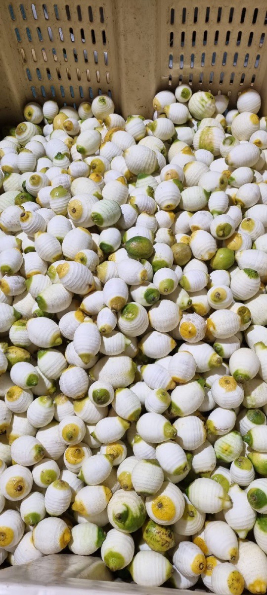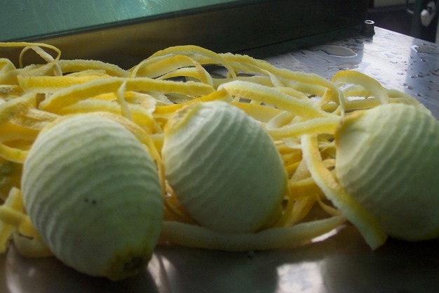 Una vez finalizada la operación de pelado, el limón pasa por un sistema de corte opcional, que lo parte por la mitad. A menudo, este proceso termina con un exprimido muy natural, realizado por dos cintas que, mediante una suave presión, extraen el zumo ecológico, natural y sin conservantes.