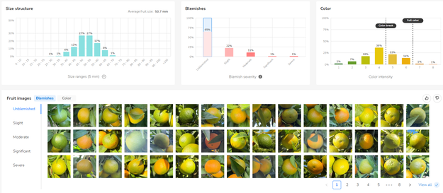 En 2025, Agrucorse recurrió a la inteligencia artificial para controlar el calibre y la coloración de los frutos en los campos. "Una primicia en la citricultura corsa", afirma la empresa. Normalmente, después del cuajado, se miden las clementinas para controlar su crecimiento. "A lo largo del año se miden miles de frutos con un calibrador en los campos", indica un técnico de Terre d'Agrumes, "y hay que analizar manualmente otros tantos valores". Es un trabajo tedioso, pero esencial para prever los volúmenes de cada calibre. Este año, sin embargo, la empresa ha optado por probar una aplicación desarrollada por la start-up Aerobotics, que usa simples fotos tomadas en los campos para analizar el calibre, la coloración y los posibles defectos de miles de clementinas. A partir de todos estos datos, la herramienta dibuja una curva de crecimiento del fruto, semana a semana, que va evolucionando hasta predecir su calibre en el momento de la cosecha.