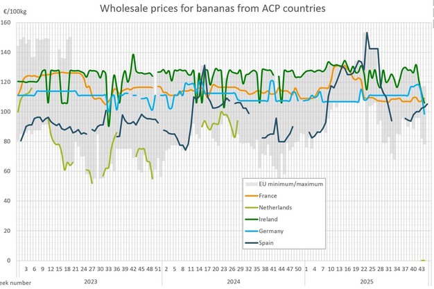 Los precios medios al por mayor de la banana en toda la UE registraron ligeros descensos en varios mercados en la semana 45 (finalizada el 09-11-25) en comparación con la semana 44 (finalizada el 02-11-25).