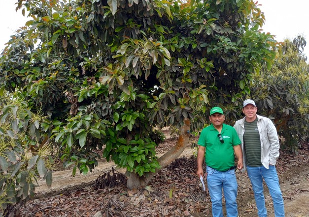 Guido García Mendoza (jefe de operaciones) y Claudio Villegas (propietario del fundo) delante de un árbol de la variedad Zutano. "En esta parcela de 8 hectáreas de aguacates Hass, hay unos 105 árboles de Zutano, que sirven como polinizadores", dice Villegas, quien, después de tres años de colaboración con el Grupo Juan Ruiz, destaca que se siente acompañado y respaldado en todo el proceso de cultivo y comercial. "Además, no sufro pérdidas por descarte de fruta, ya que el grupo compra toda la producción".