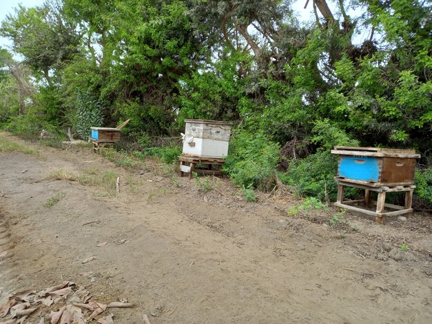 Colmenas ubicadas a lo largo de una hilera de árboles, que protege la parcela de problemas fúngicos causados por los vientos fríos y húmedos provenientes del océano Pacífico, a cinco kilómetros de distancia.