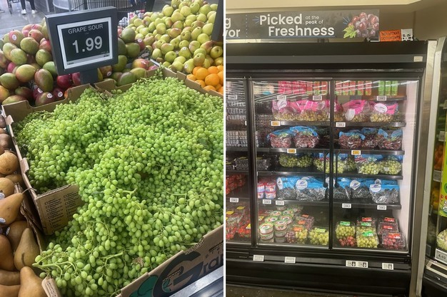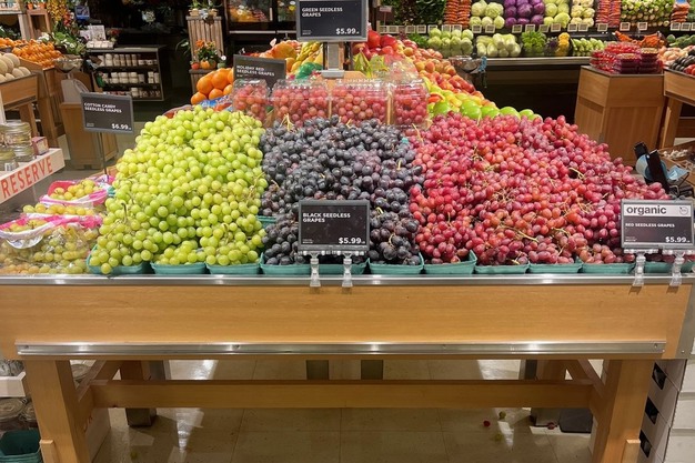 Derecha: uvas expuestas tras una puerta de cristal con etiquetas electrónicas en los estantes.