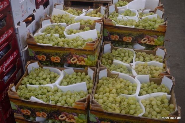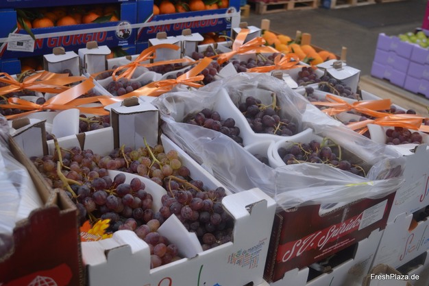 Mientras la campaña de cítricos se acelera, la de la uva toca a su fin. "Ahora estamos ofreciendo las últimas variedades de la temporada, como las Kelly blancas de Apulia (foto de abajo) y las uvas rojas Allison (foto de arriba) de Sicilia. Las primeras uvas de ultramar ya se ofrecían a mediados/finales de octubre, mucho antes que hace 10-20 años". Con todo, Di Bari puede afirmar que la temporada de uvas ha sido un éxito: "A diferencia de las naranjas, aquí la sequía volvió a jugar a nuestro favor, permitiéndonos aprovechar todo el potencial en términos de cantidad y calidad".