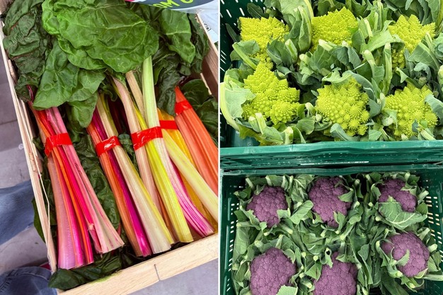 "En invierno, la gama suele ser un poco más llamativa. Coliflores de colores, con variedades moradas o naranjas, pero también coles picudas moradas; todo el mundo se las lleva puramente por el efecto estético. El sabor apenas varía, pero a la gente le gustan los colores. Algunos clientes montan sus puestos tan bien que los convierten en una auténtica paleta de colores. De esa manera, los productos destacan mucho. En el periodo prenavideño, esto es algo que se va viendo cada vez más. Los productos nuevos o especiales nos animan tanto a nosotros como a los clientes. Las acelgas, por ejemplo, tienen un color intenso y muy bonito, y aunque no dejan de ser un producto de nicho, a la gente le gusta probar cosas nuevas".
