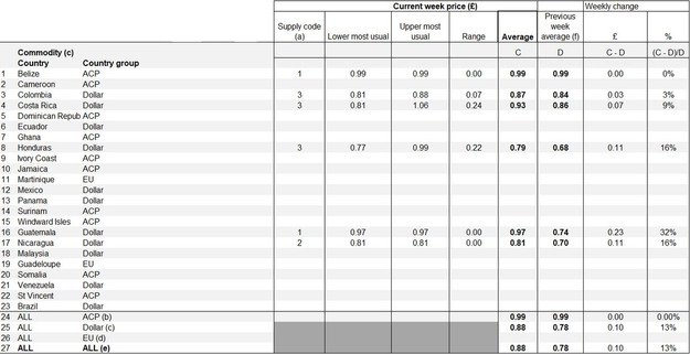 Belice fue el único origen ACP con cotización en la semana 47. Su precio medio se mantuvo en 0,99 libras por kilo, sin cambios respecto a la semana anterior. Camerún y los demás proveedores ACP de la lista no comunicaron precios.