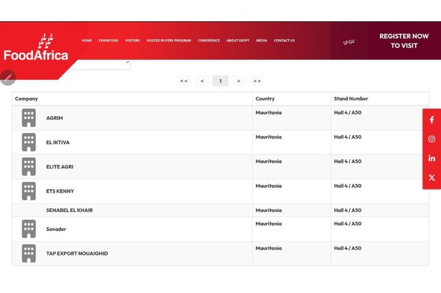 El pabellón mauritano hará su primera aparición en la décima edición de la feria Food Africa, que se celebrará del 9 al 12 de diciembre en El Cairo. Según Aichetou Taffa, directora de inversiones agrícolas y promoción de las exportaciones de la Sociedad Nacional de Desarrollo Rural, esto se inscribe en la ambición de Mauritania de convertirse en un origen importante de frutas y hortalizas y abrirse a más mercados e inversores.