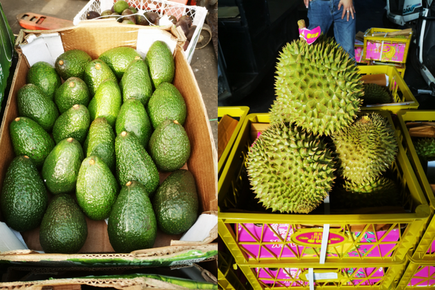 Izquierda: aguacates peruanos. Derecha: durián vietnamita Kanyao.