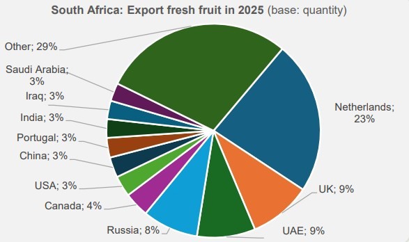 Sudáfrica ha registrado un crecimiento considerable de las exportaciones de fruta fresca este año, alcanzando casi 5 millones de toneladas; un volumen de récord. En los tres años anteriores, las exportaciones se habían mantenido relativamente estables, en torno a los 4,2 millones de toneladas. Para comparar, hace 10 años, el volumen de exportación rondaba los 3 millones de toneladas. Algo menos de una cuarta parte de la fruta fresca sudafricana se exporta a los Países Bajos.