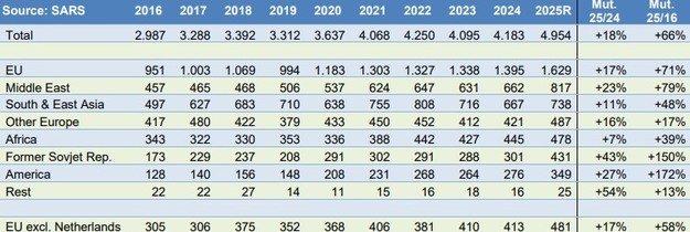 Los Países Bajos son el mayor comprador europeo, con 1,15 millones de toneladas. Segundo en el ranking, aunque a bastante distancia, está Portugal, con 150.000 toneladas, mientras que Italia ocupa el tercer lugar con algo más de 100.000 toneladas. Las exportaciones a Oriente Medio han crecido incluso más que las que se dirigen a los Países Bajos: un 23% con respecto al año pasado y un 80% en los últimos 10 años. En términos absolutos, hablamos de 817.000 toneladas este año, la mayoría de las cuales, 437.000 toneladas, se destinaron a Emiratos Árabes Unidos.