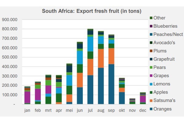 La mayor parte de las exportaciones sudafricanas de fruta se llevan a cabo entre junio y septiembre, cuando las exportaciones de naranjas, satsumas y limones alcanzan sus niveles máximos. La temporada de exportación de manzanas es más escalonada y se desarrolla entre marzo y octubre. Las uvas se exportan sobre todo en el periodo de diciembre a marzo, y las peras entre enero y septiembre. Las exportaciones de aguacate registran sus niveles máximos entre marzo y junio, mientras que la temporada de arándanos va de finales de agosto a diciembre.