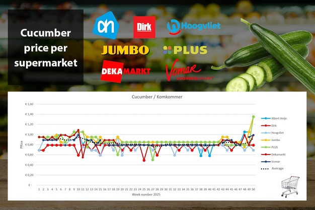 El precio del pepino se ha disparado en la semana 50. La unidad cuesta 1,35 euros tanto en Albert Heijn como en Jumbo y Plus. En Plus estaba antes a 79 céntimos, lo que supone una subida de 56 céntimos. Albert Heijn y Jumbo han subido los suyos 30 céntimos. En DekaMarkt también está 20 céntimos más caro, pero su precio se mantiene por debajo del euro, en 99 céntimos. Vomar ha subido su precio 4 céntimos, por lo que también se queda en 99 céntimos. Entre todas estas subidas de precio, Hoogvliet destaca con una rebaja, de 79 a 69 céntimos. Dirk mantiene el precio en 79 céntimos. De media, el precio semanal ha subido 19 céntimos, hasta 1,07 euros por unidad.