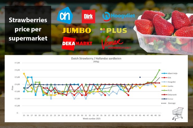 No hay envases de 400 gramos de fresas en el surtido online de Jumbo esta semana, por lo que solo 3 de las 6 cadenas de retail cuyos datos recopilamos disponen de fresas online: Albert Heijn, PLUS y DekaMarkt. El precio en DekaMarkt se mantiene sin cambios, por lo que el producto está bastante más barato (4,19 euros) que en las otras dos cadenas, que han subido sus precios un euro, hasta alcanzar los 5,99 euros.