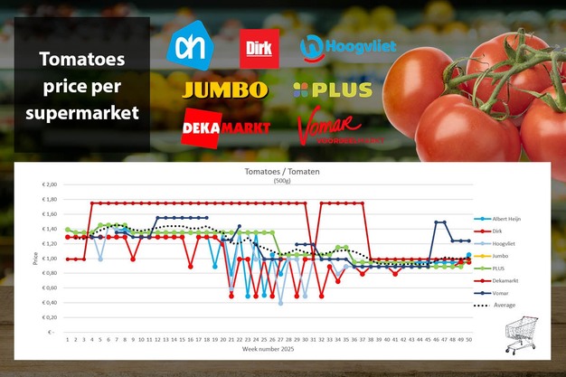 Los datos de precios proceden de Supermarktscanner.nl y se basan en los precios disponibles online en las tiendas web de Albert Heijn, Jumbo, Plus, DekaMarkt, Dirk y Hoogvliet. El precio es una media, incluyendo ofertas activas. Para la comparación de precios no se tiene en cuenta ni el origen ni la calidad, dado que la mayoría de supermercados no aportan estos datos en sus páginas web. Hoogvliet y Jumbo sí mencionan el país de origen. Por ello, no se descarta que en la comparativa se estén equiparando, por ejemplo, aguacates verdes con maduros, o pepinos españoles con holandeses.