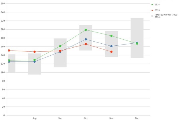 En casi todos los casos, los precios del tomate en noviembre han sido inferiores a los del año anterior. Como viene siendo habitual, una de las excepciones ha sido Francia, donde los tomates cherry y las especialidades han alcanzado mejores precios en noviembre que en 2024. En general, los precios del tomate en noviembre en la Unión Europea se han situado por debajo de la media quinquenal, con un precio medio de 1,48 euros por kilo. Países Bajos ha sido la excepción en este caso, según muestran las cifras que maneja la Comisión Europea.