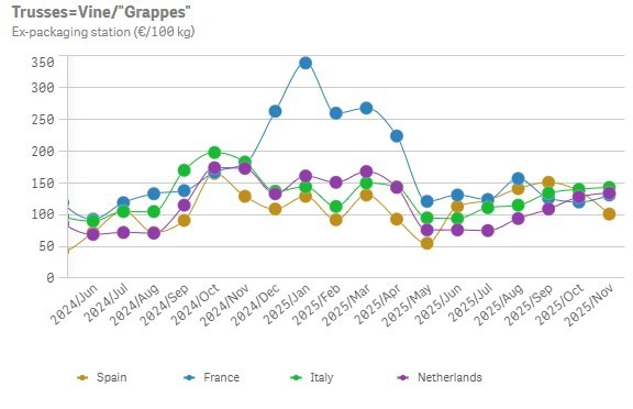 En noviembre, los precios medios en los Países Bajos han superado la media quinquenal. El precio de los tomates en rama se ha situado en 1,34 euros por kilo, un 10% por encima de la media quinquenal, y el precio de los tomates a granel ha sido un 2% más alto (83 céntimos de euro), mientras que los tomates cherry y las especialidades han registrado un valor medio de 3,55 euros por kilo, un 30% más.