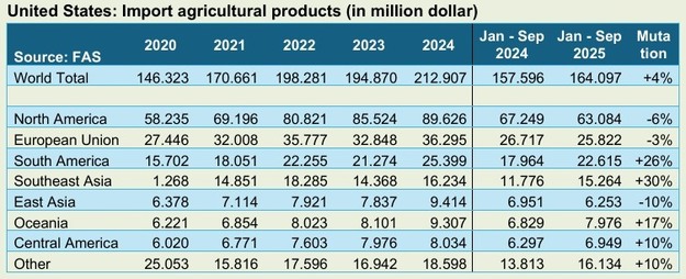 Basándose en los datos disponibles hasta septiembre, se estima que el valor de las importaciones estadounidenses de productos agrícolas en el último año ha ascendido a unos 220.000 millones de dólares, mientras que el de las exportaciones se ha situado en unos 176.000 millones de dólares. Las importaciones han seguido aumentando, mientras que las exportaciones se han mantenido al mismo nivel que en 2024.