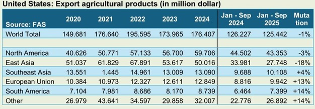 En lo que respecta a las exportaciones, México y Canadá son los principales socios comerciales de Estados Unidos. Ambos países adquirieron cada uno unos 30.000 millones de dólares en productos agrícolas estadounidenses. En 2025 se ha registrado un ligero crecimiento de las exportaciones a México, mientras que las exportaciones a Canadá han caído en alrededor de un 5%.