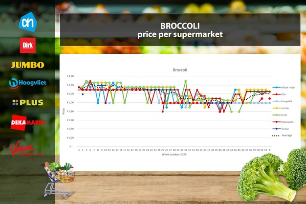 Pocos cambios para el brócoli en la primera semana de 2026. Tanto en Hoogvliet como en Plus, Dirk y DekaMarkt, los precios se mantienen estables. Solo Albert Heijn y Jumbo han bajado los suyos 4 céntimos, situándose ambos en 1,25 euros.