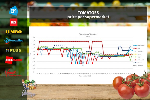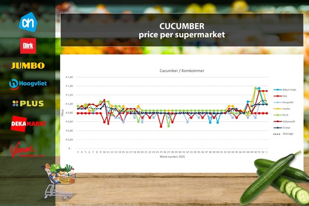 Los datos de precios proceden de Supermarktscanner.nl y se basan en los precios disponibles online en las tiendas web de Albert Heijn, Jumbo, Plus, DekaMarkt, Dirk y Hoogvliet. El precio es una media, incluyendo ofertas activas. Para la comparación de precios no se tiene en cuenta ni el origen ni la calidad, dado que la mayoría de supermercados no aportan estos datos en sus páginas web. Hoogvliet y Jumbo sí mencionan el país de origen. Por ello, no se descarta que en la comparativa se estén equiparando, por ejemplo, aguacates verdes con maduros, o pepinos españoles con holandeses.
