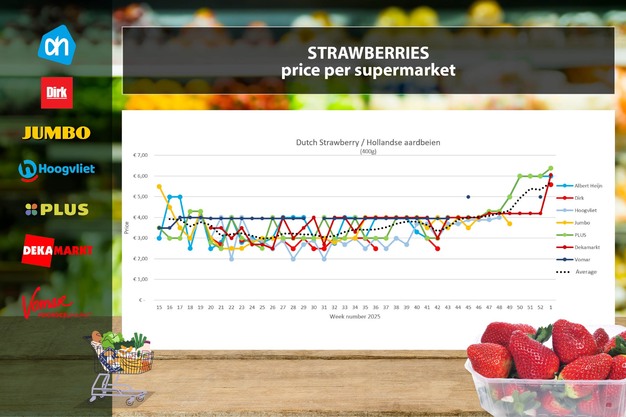 Tras una ausencia de varias semanas en el surtido online de Dirk y Jumbo, ha vuelto a haber fresas disponibles en la primera semana de 2026. Sin embargo, los precios en Jumbo han aumentado de manera considerable, situándose en 6,38 euros. En Dirk, el producto cuesta 5,58 euros. También se observan subidas de precios en Plus y DekaMarkt, donde se sitúan en 6,38 y 6,06 euros, respectivamente. Solo Albert Heijn mantiene estable su precio en 5,99 euros.