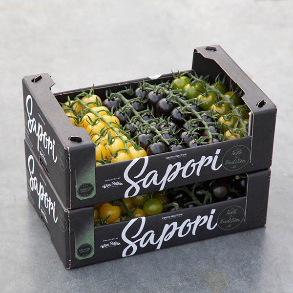Sapori | Finest Selection, de Wim Peters Kwekerijen (pabellón 1.2, C-51), de los Países Bajos, destaca por sus aromas y colores únicos. Se trata de una selección especialmente refinada de tomates cherry mini, que destaca tanto por sus aromas como por sus colores. Los frutos de esta selección de 1,5 kg destacan por sus colores marfil, negro y verde.