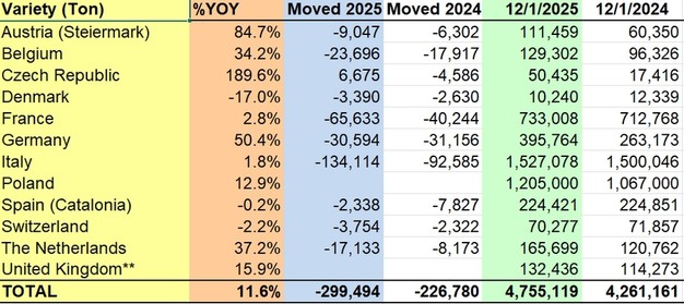 Francia tiene 733.008 toneladas, frente a las 712.768 del año pasado, mientras que Alemania registró 395.764 toneladas, frente a las 263.173 del año anterior, lo que refleja un aumento interanual del 50,4%. Bélgica pasó de 96.326 toneladas a 129.302, con un aumento interanual del 34,2%.