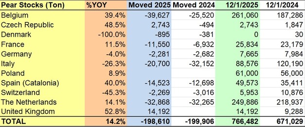 Las existencias totales de peras europeas alcanzaron las 766.482 toneladas el 1/12/2025, frente a las 671.029 toneladas del año anterior, lo que representa un incremento interanual del 14,2%. La salida de peras se situó en -198.610 toneladas en 2025, muy en línea con las -199.906 toneladas de 2024.
