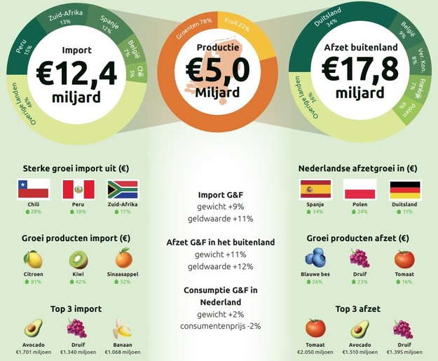 Tanto la producción como las importaciones y exportaciones han registrado un claro crecimiento. Los consumidores holandeses también han comprado algo más de fruta y hortalizas, lo que subraya la creciente importancia económica y social del sector.