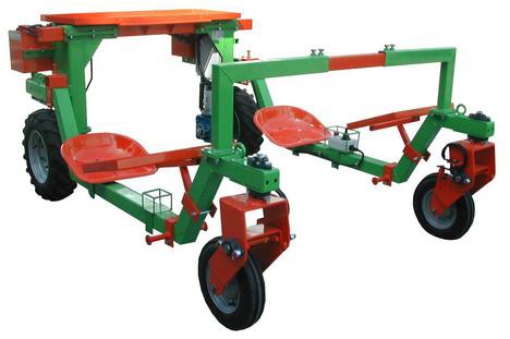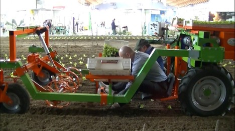 La máquina está en disposición de trasplante, con rodillo dentado para hacer agujeros y dos puestos centrales para el trasplante manual.