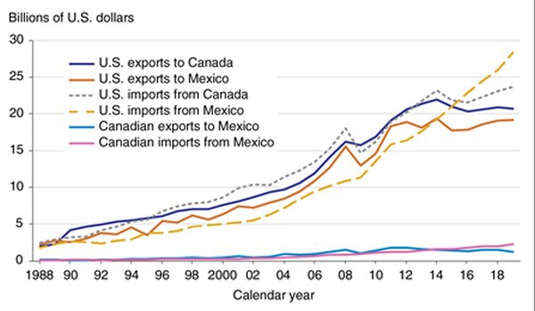 La agricultura tiene una participación grande y cada vez mayor en el comercio intrarregional de la zona de libre comercio creada por el TLCAN. El valor total del comercio agrícola intrarregional (exportaciones e importaciones) de los tres países del TLCAN alcanzó unos 95.300 millones de dólares en 2019, en comparación con los 16.600 millones de 1993 (el año anterior a la entrada en vigor del tratado).