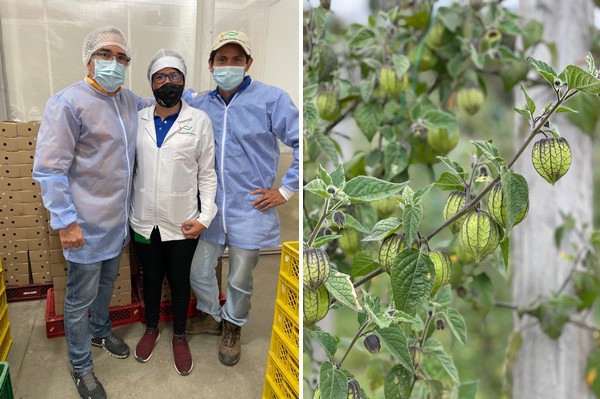 De izquierda a derecha: Frank Martínez, Yenny Carolina Reyes, experta en química de los alimentos; Julio Alexander, ingeniero agrónomo. A la derecha: cultivo de uchuvas.