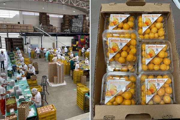 Izquierda: instalación de envasado; derecha: los envases de las uchuvas tienen un etiquetado mínimo para que la gente pueda ver el producto