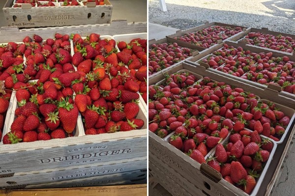 "Es porque ha hecho mucho frío. Tuvimos una pequeña helada tardía que las retrasó y hemos tenido lluvias. Ha sido una lucha", dice Rhonda Driediger, de Driediger Farms, en Langley (Columbia Británica). "Pero parece que vamos a tener una cosecha de buen tamaño, lo cual es bueno porque las primeras fresas van a ser un poco escasas. Sin embargo, creo que nuestra producción de mediados y finales de temporada será bastante abundante".