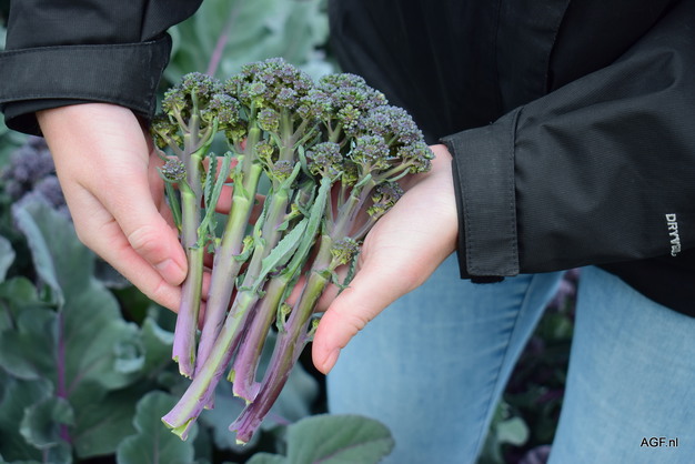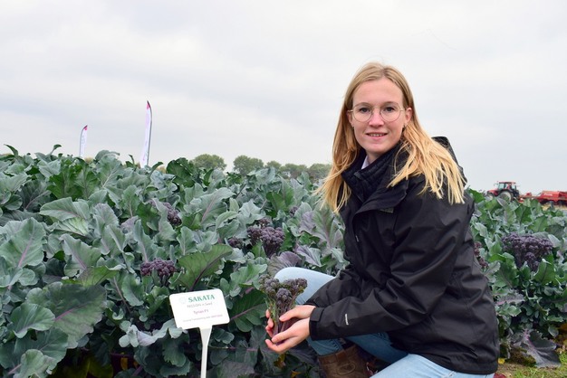 Linda Ruiter, Product Developer Benelux, muestra los brotes tiernos de brócoli morado.