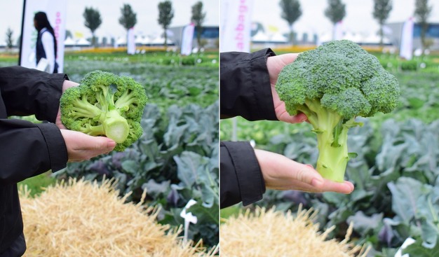 La primera parada fue la sección del brócoli, en la que Linda mostró Leonidas, una variedad de excelente calidad, tanto externa como interna. "El brócoli Leonidas tiene un hermoso color verde oscuro, un porte alto, una forma redondeada y un tallo grueso. Si el brócoli crece rápido, a veces se puede formar un hueco en el tallo, lo cual ocurre cuando de repente hace calor y el crecimiento se acelera. Aunque el brócoli tenga buen aspecto, un tallo hueco suele ser motivo para el rechazo de un lote por parte del retail".
