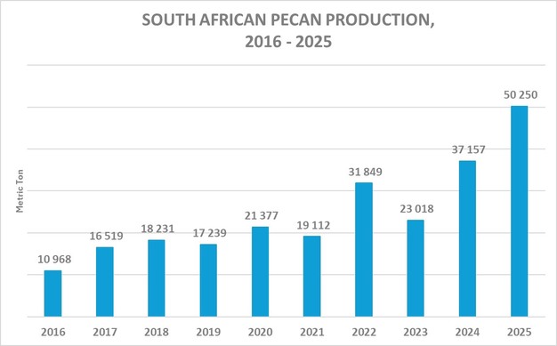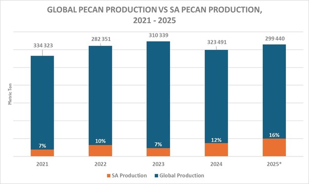 En 2025, Sudáfrica produjo el 16% de la cosecha mundial de nueces pecanas.