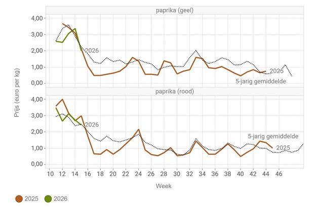 Los precios de los pimientos verdes, amarillos y naranjas son superiores a los de hace un año. No así el precio de los rojos. El volumen de pimientos rojos y verdes es inferior al de hace un año. El volumen de pimientos amarillos es superior.