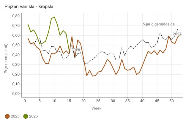 El precio unitario de la lechuga arrepollada baja, pero con 68 céntimos de euro por unidad se sitúa en el nivel medio de los últimos cinco años, tras una primavera de precios fuertes.
