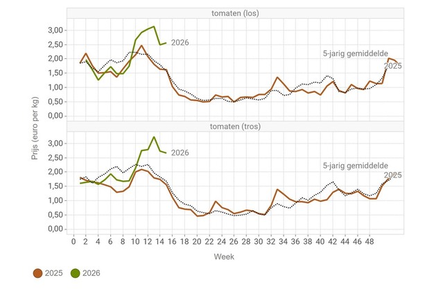 Un menor volumen de tomates volvió a producir un precio más alto en la semana 16 que hace un año. Los precios medios por kilogramo en las subastas de la Federación de Cooperativas Hortícolas Belgas (VBT) son de 1,67 euros para los tomates sueltos y de 1,86 euros para los tomates en rama.