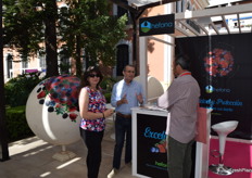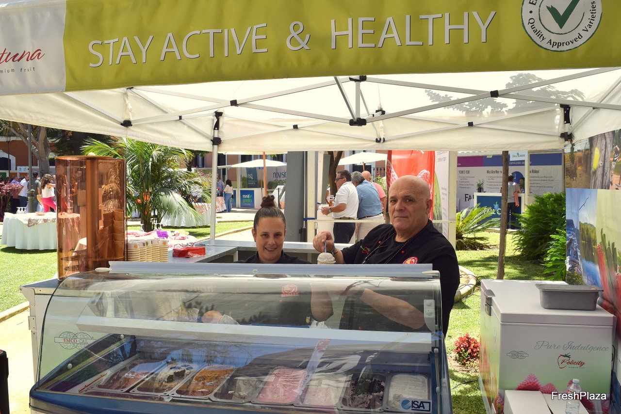 Fátima Pérez y José Manuel Navarro, de Emco Cal, trajeron las variedades de fresa Florida Fortuna, Felicity y la singular fresa blanca Florida Pearl, en un sabroso formato: en forma de helado, que todos degustamos (… y en repetidas ocasiones) en los jardines de la Casa Colón