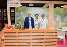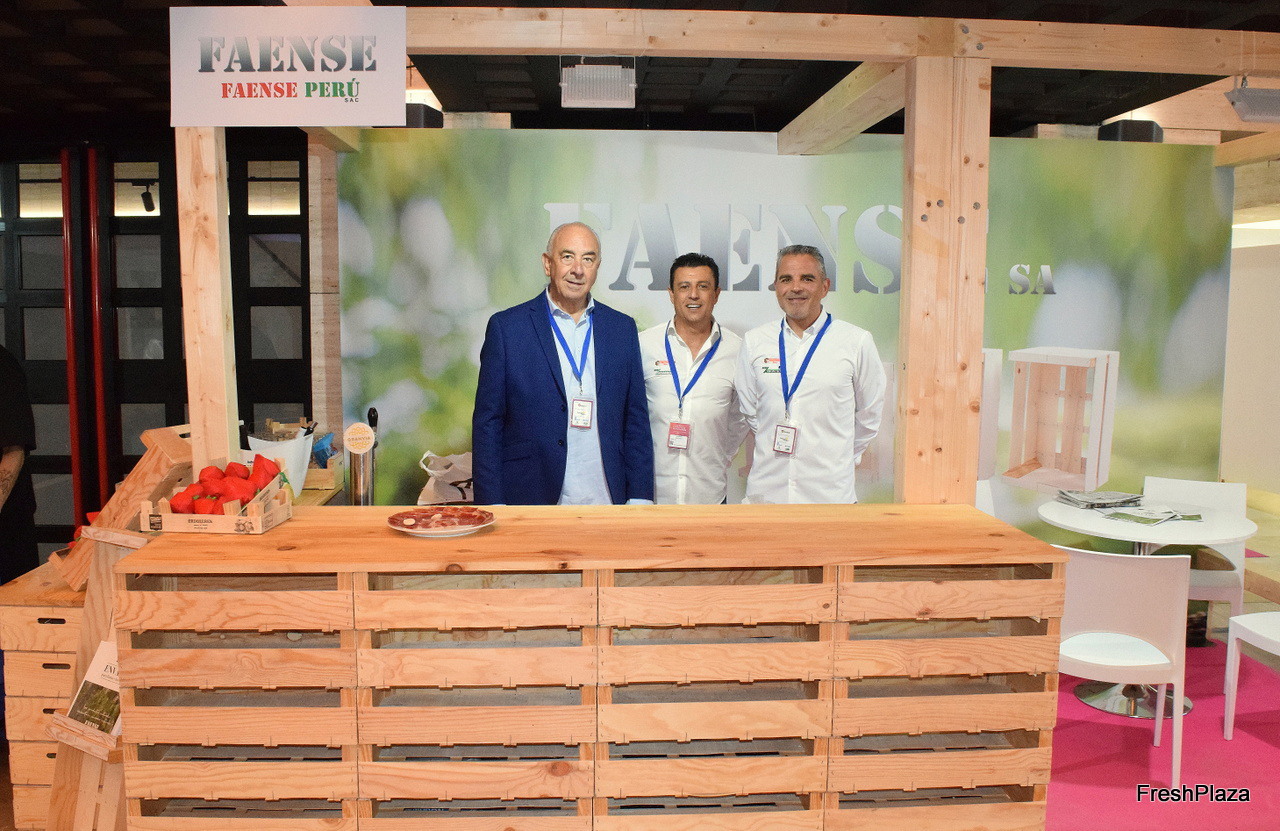 Juan Sabater, Mariano Márquez y Juan Sabater, en el stand de Faense S.A., construido con los envases de madera que fabrica la firma con centrales en Valencia y Perú