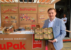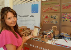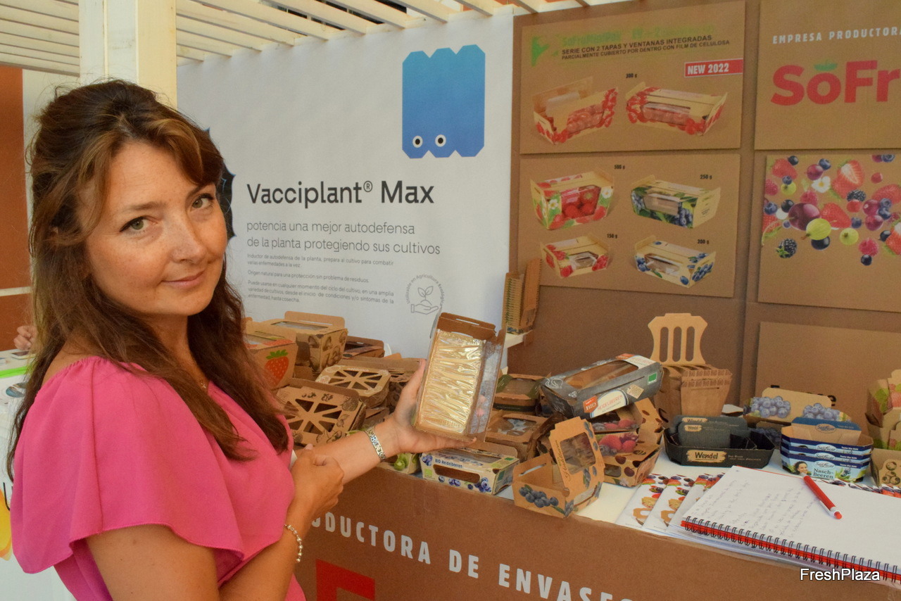 Anna muestra un envase de SoFruPack con recubrimiento interno y ventana para la visualización del producto, 100% ecológico