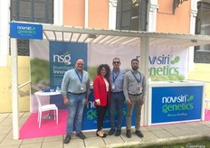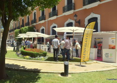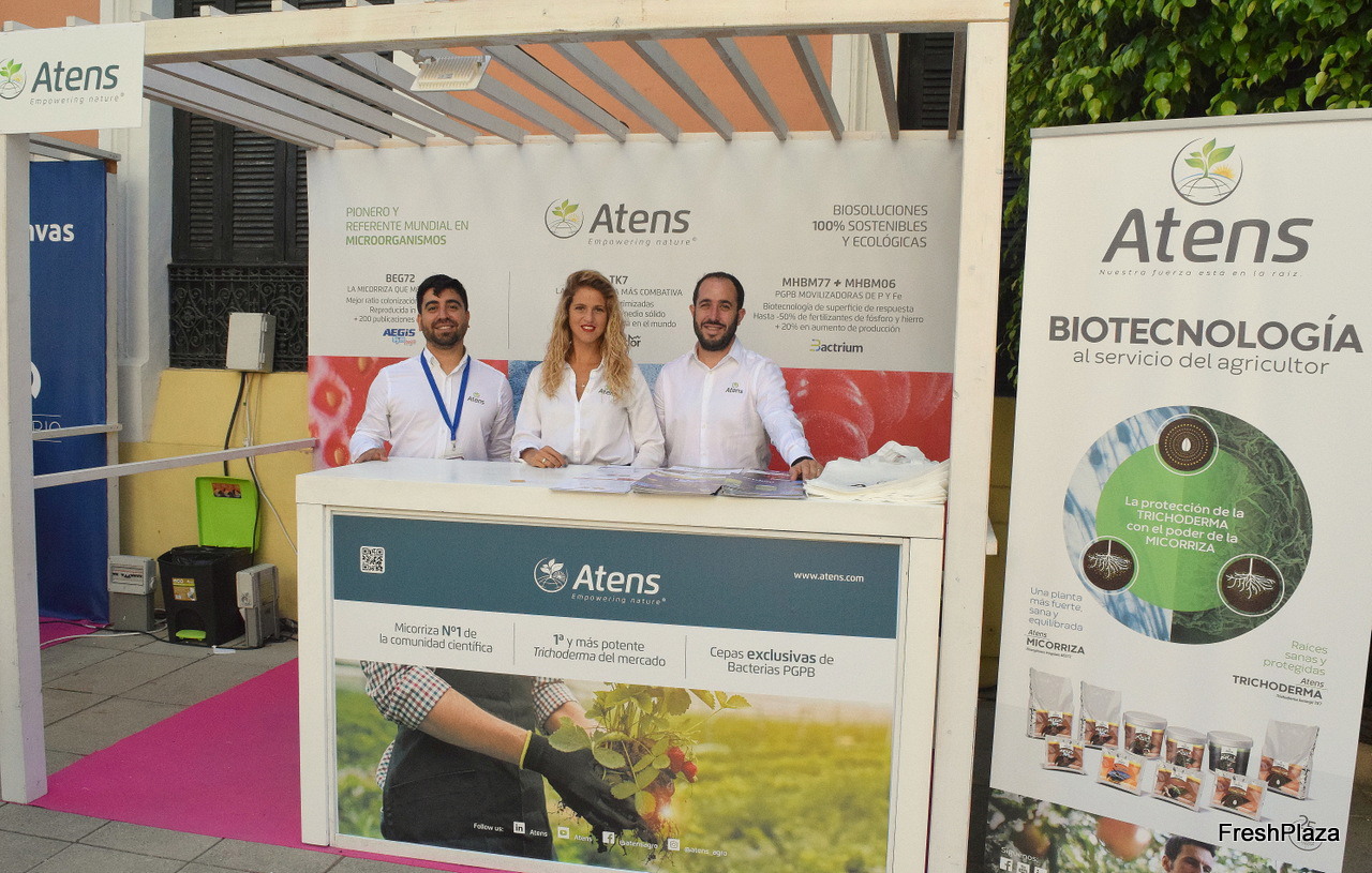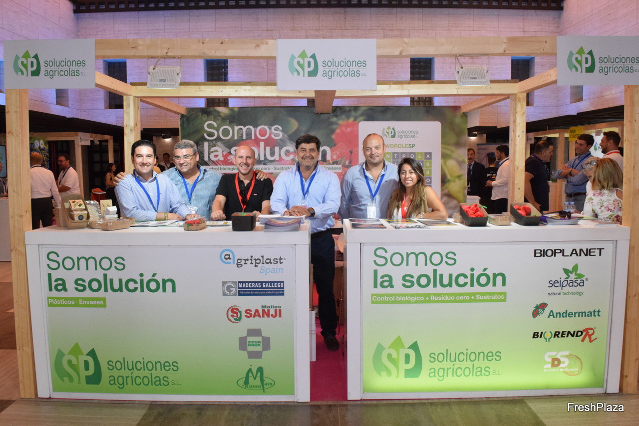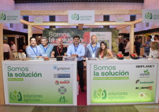 Stand de SP Soluciones Agrícolas: Manu Moreno, José M. Pecero, Fernando Barba, Pedro Écija, Juan Carlos Mora y Jéssica Panchi, técnica de control Biológico de Bioplanet