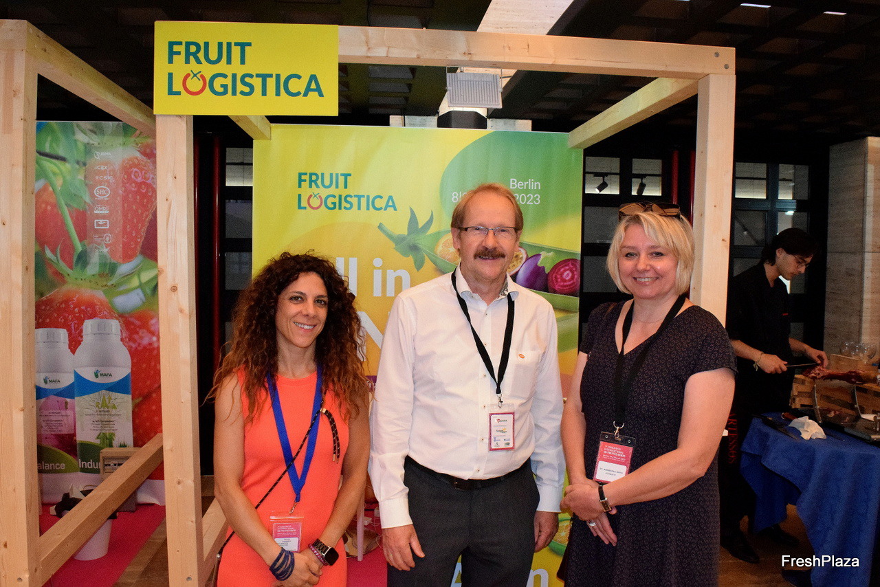 Vanesa Campesino, representante de la feria Fruit Logistica en España, junto a Hans-Christof Behr, director adjunto de la consultora alemana AMI, y Agnieszka Wrynk, de Ewa-Bis (Polonia), quienes fueron ponentes de una interesante mesa de trabajo sobre “Nuevos mercados emergentes para el sector de los frutos rojos” en la que hicieron un completo análisis de los mercados alemán y polaco