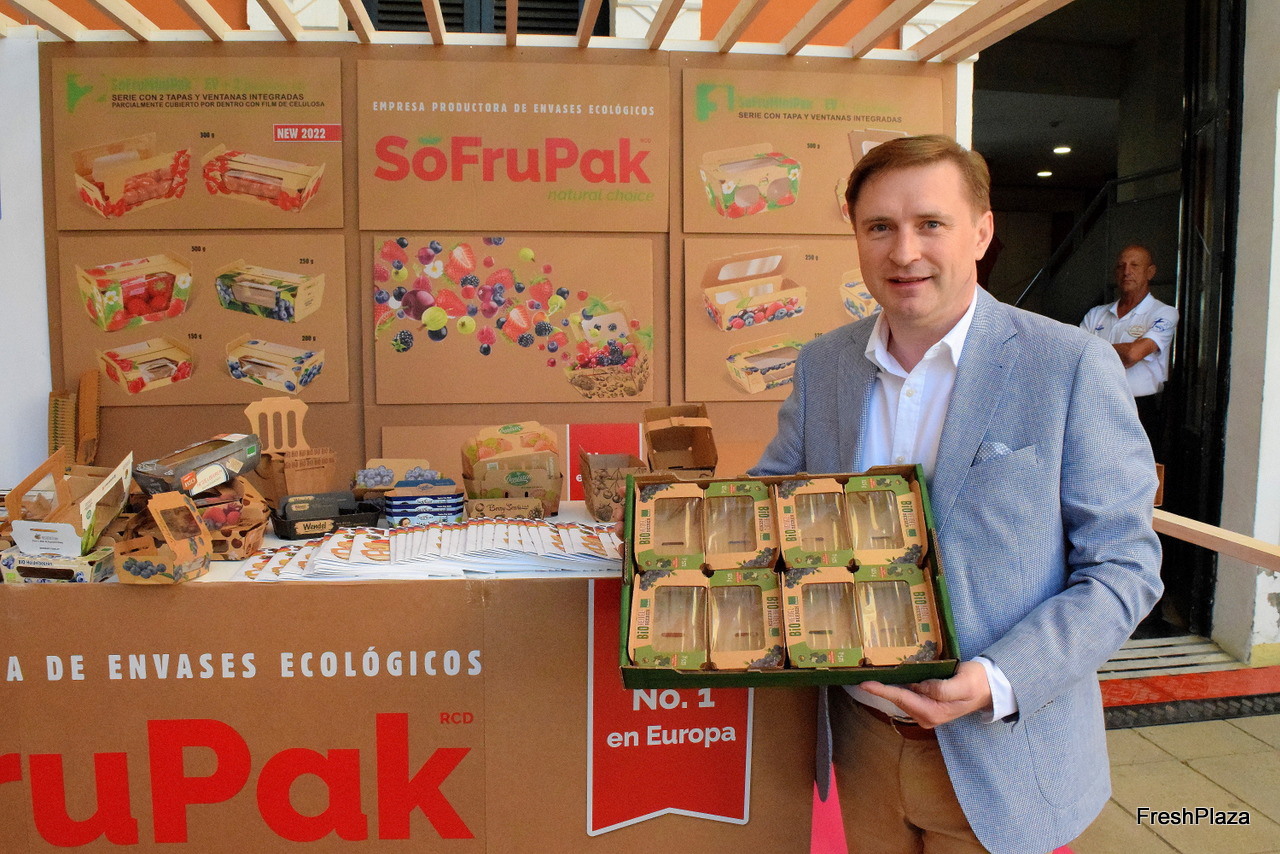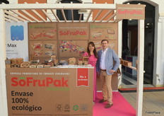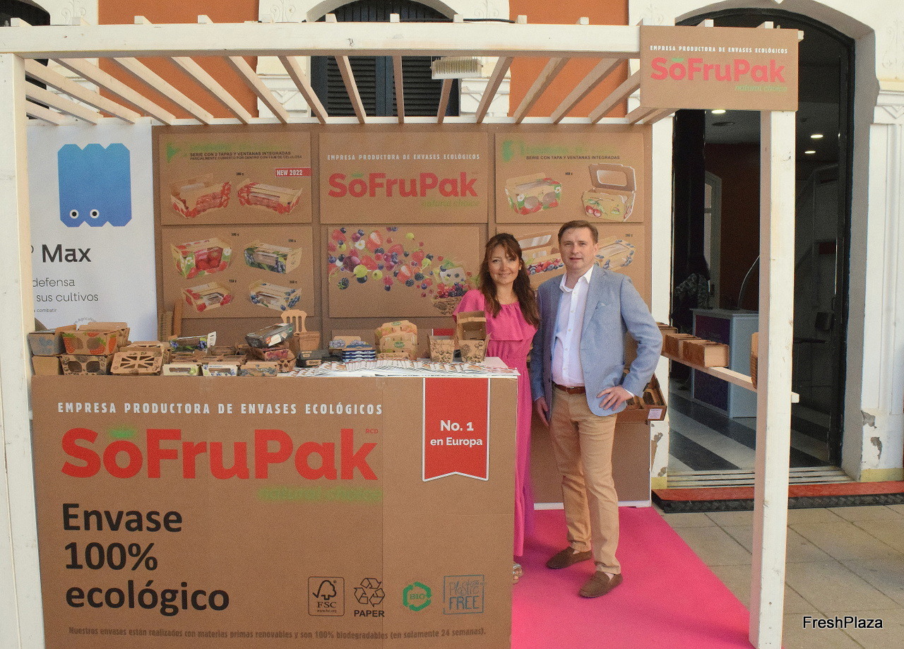 Anna Durska Augustynowicz, responsable comercial para España de SoFruPack, junto a Adam Sikorsk, director comercial de la firma productora de envases ecológicos, la primera en crear envases de cartón con film transparente de celulosa, apto para ventanas y también para el recubrimiento interno del envase