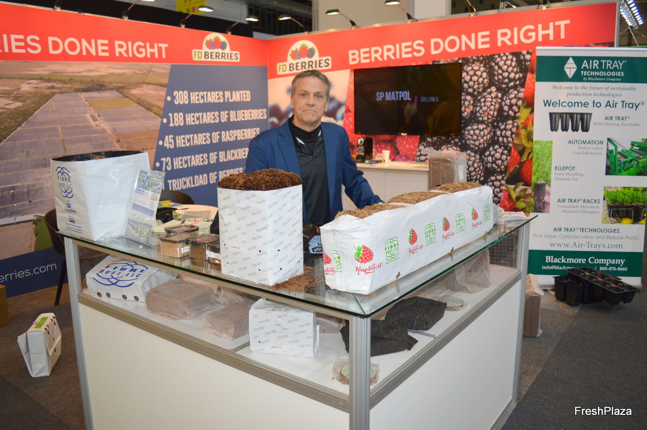 Andrew Pidgeon, de FD Berries en EE. UU., que tiene plantaciones en México, mostró sus sustratos Fiber Dust para el cultivo de berries.