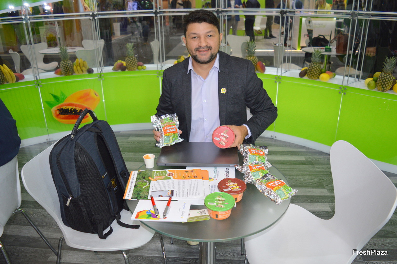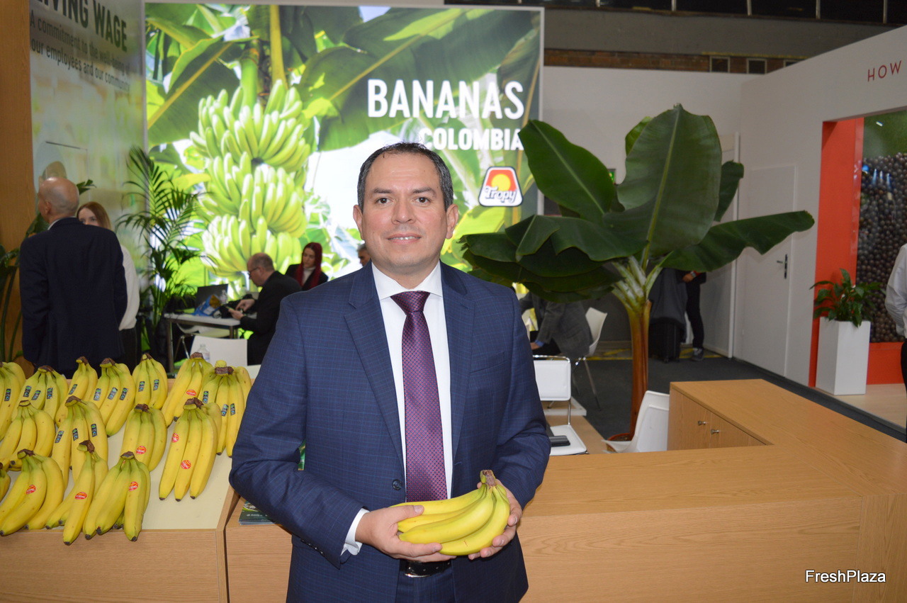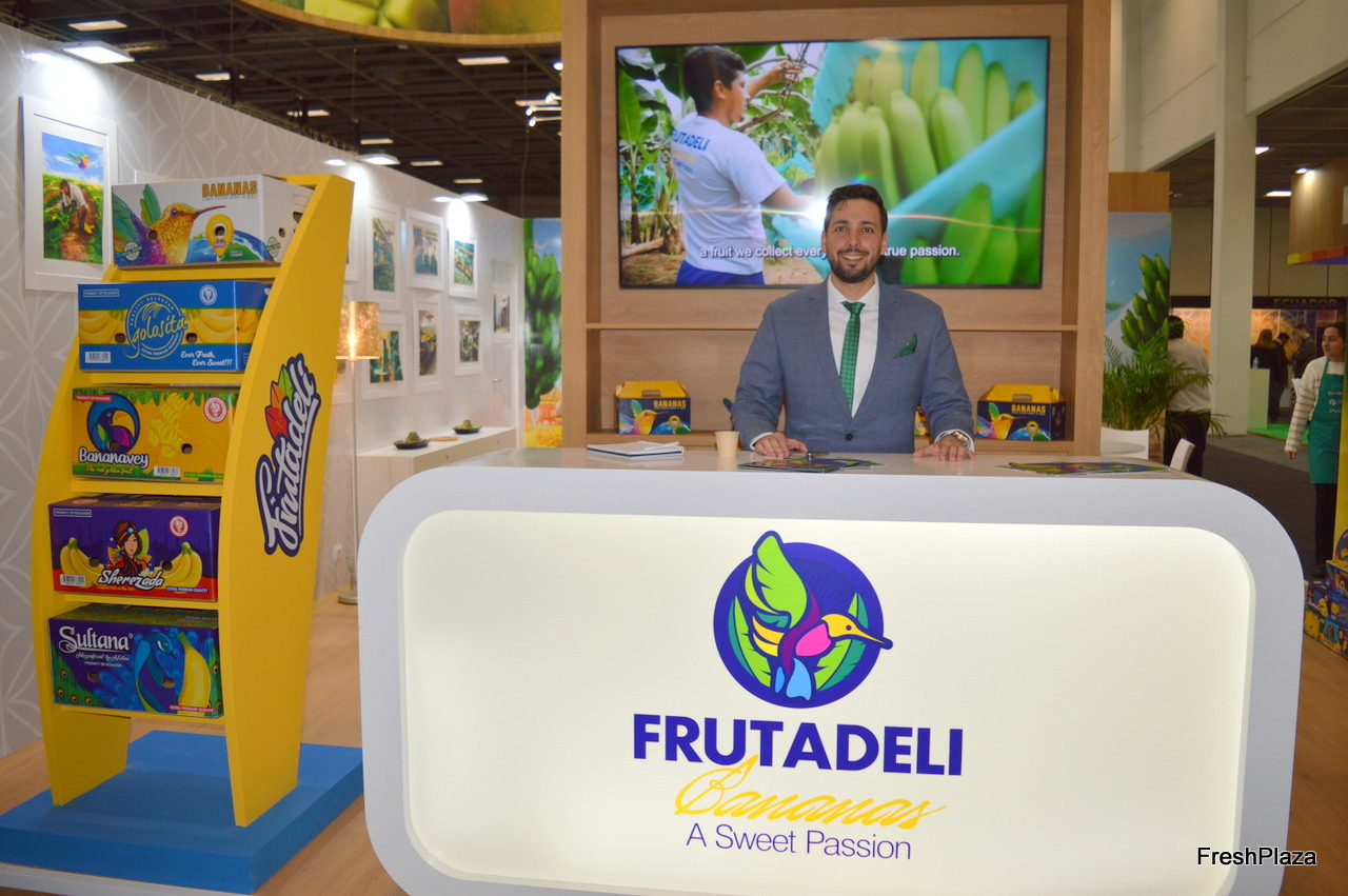 Frutadeli, exportador de bananas de Ecuador. Martín Rivadeneira dice que está contento con el interés de los visitantes en su stand.