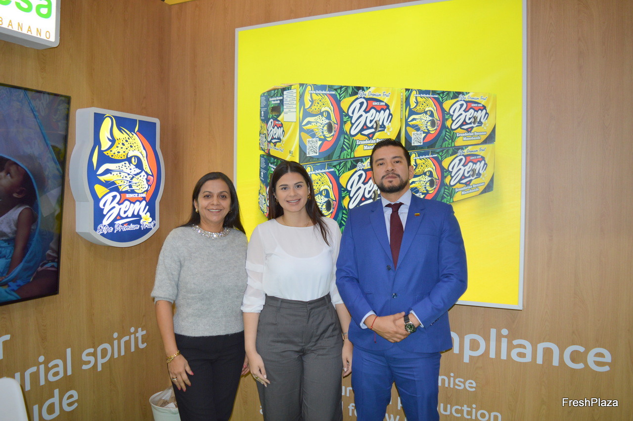 Mariana Manobanda, Jaelle Zambrano, Jack Almeida, de Delindecsa, productores y exportadores de banano de Ecuador.