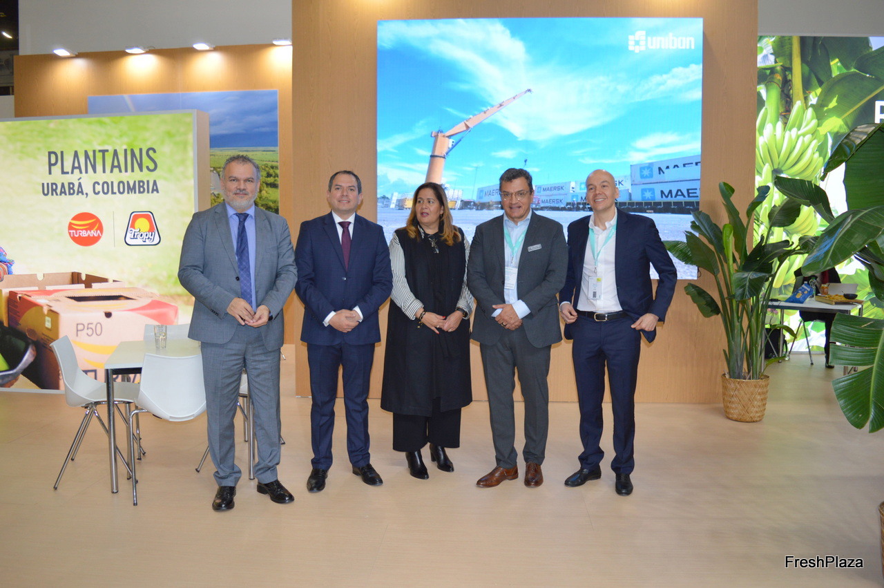 Representantes de la industria frutícola de Colombia con el Embajador en Europa, visitando los stands de sus empresas.