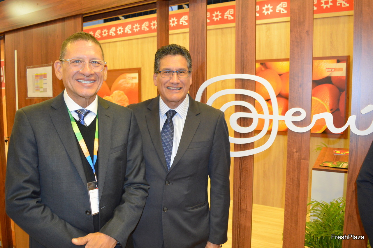 Sergio de Castello, de Prom Citrus y Gabriel Amaro, presidente de la Asociación de Gremios de Productores Agropecuarios del Perú (AGAP) en el pabellón de PromPerú.